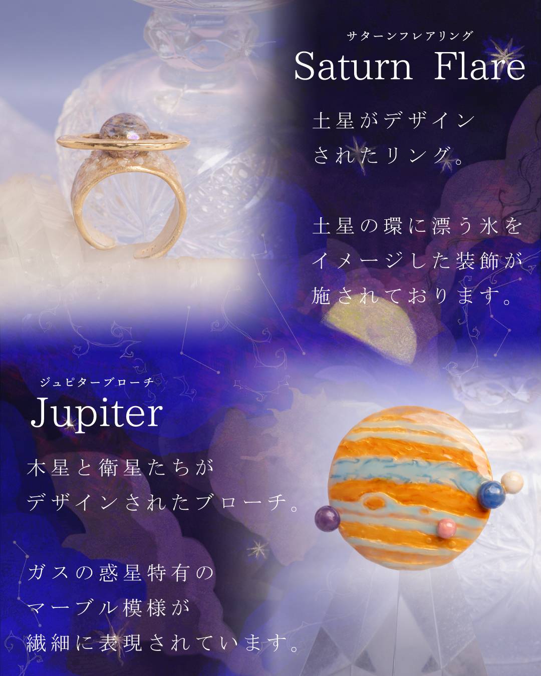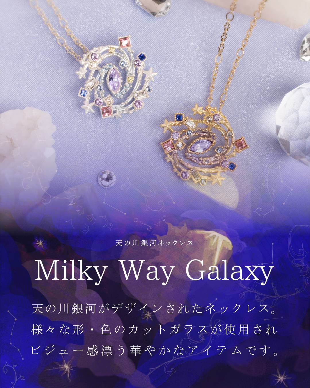 様々な形を使用したビジュー感漂う銀河のネックレスや細部の装飾にこだわっているスターワルツリングなど、ギフトシーズンにピッタリなシリーズです。