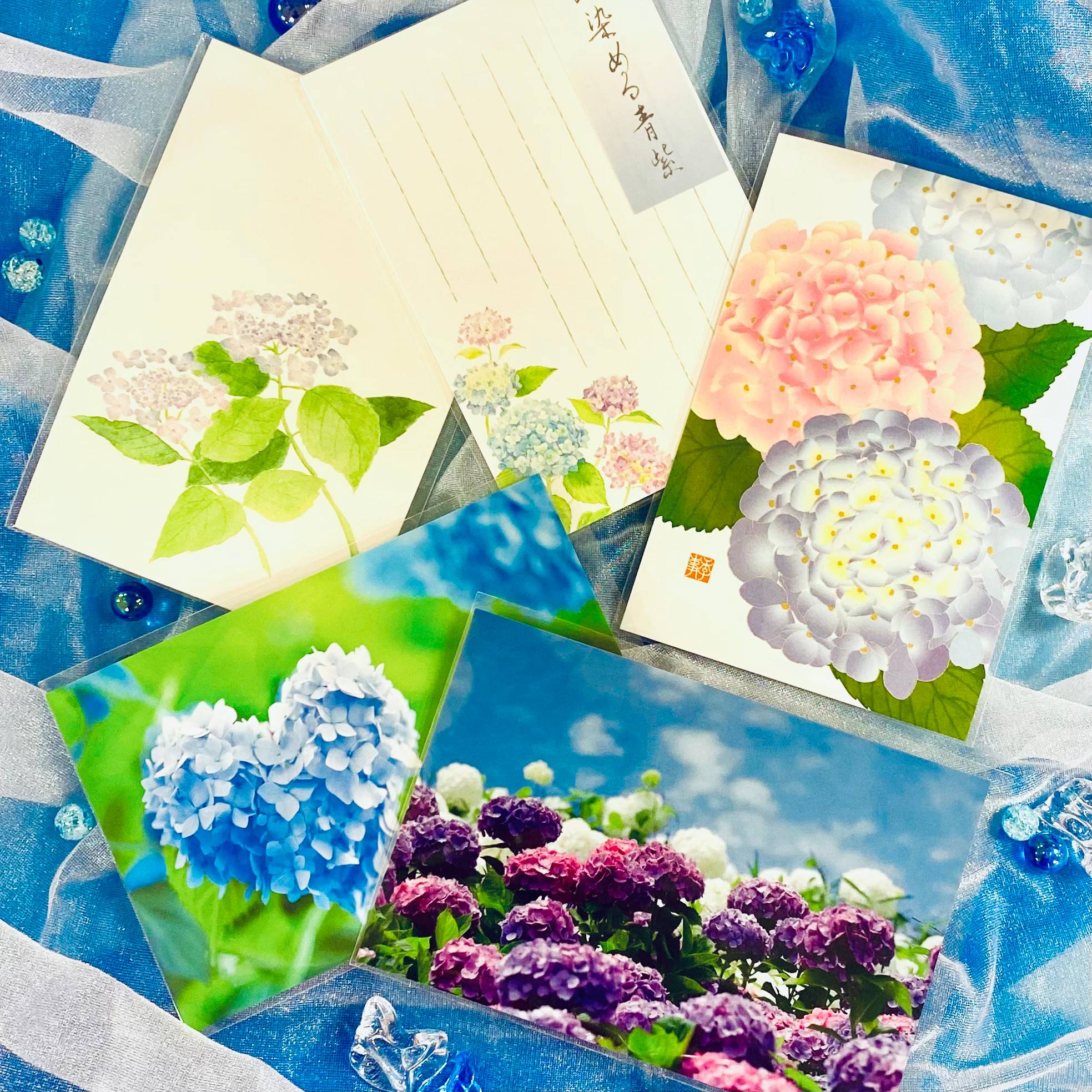 立ててお部屋に飾れる立体カードや、紫陽花のイラストや写真のポストカードなどなど…