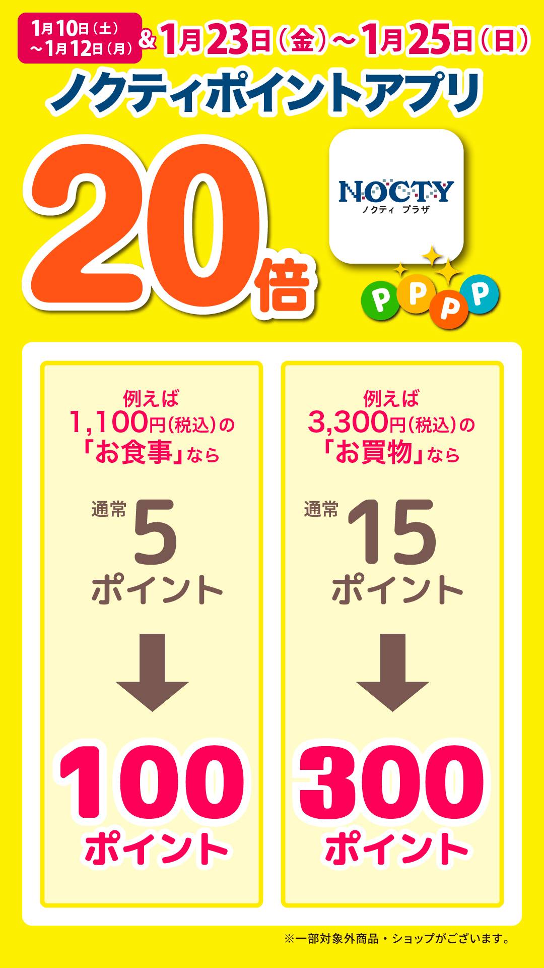 期間:2026年1月10日(土)~ 1月12日(月・祝)ノクティプラザ専門店でのお買物・ご飲食等のご利用(現金・クレジットカード・商品券にて)220円(税込)につき、通常1ポイントのところ 期間中は20ポイントプレゼントいたします。