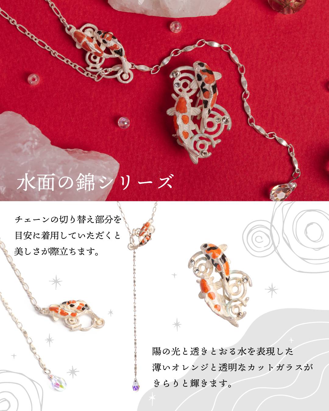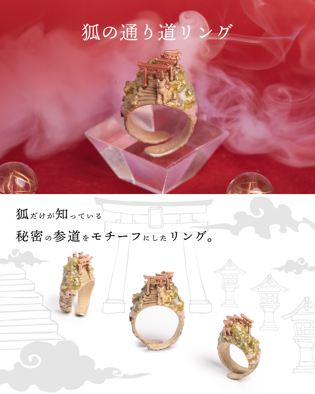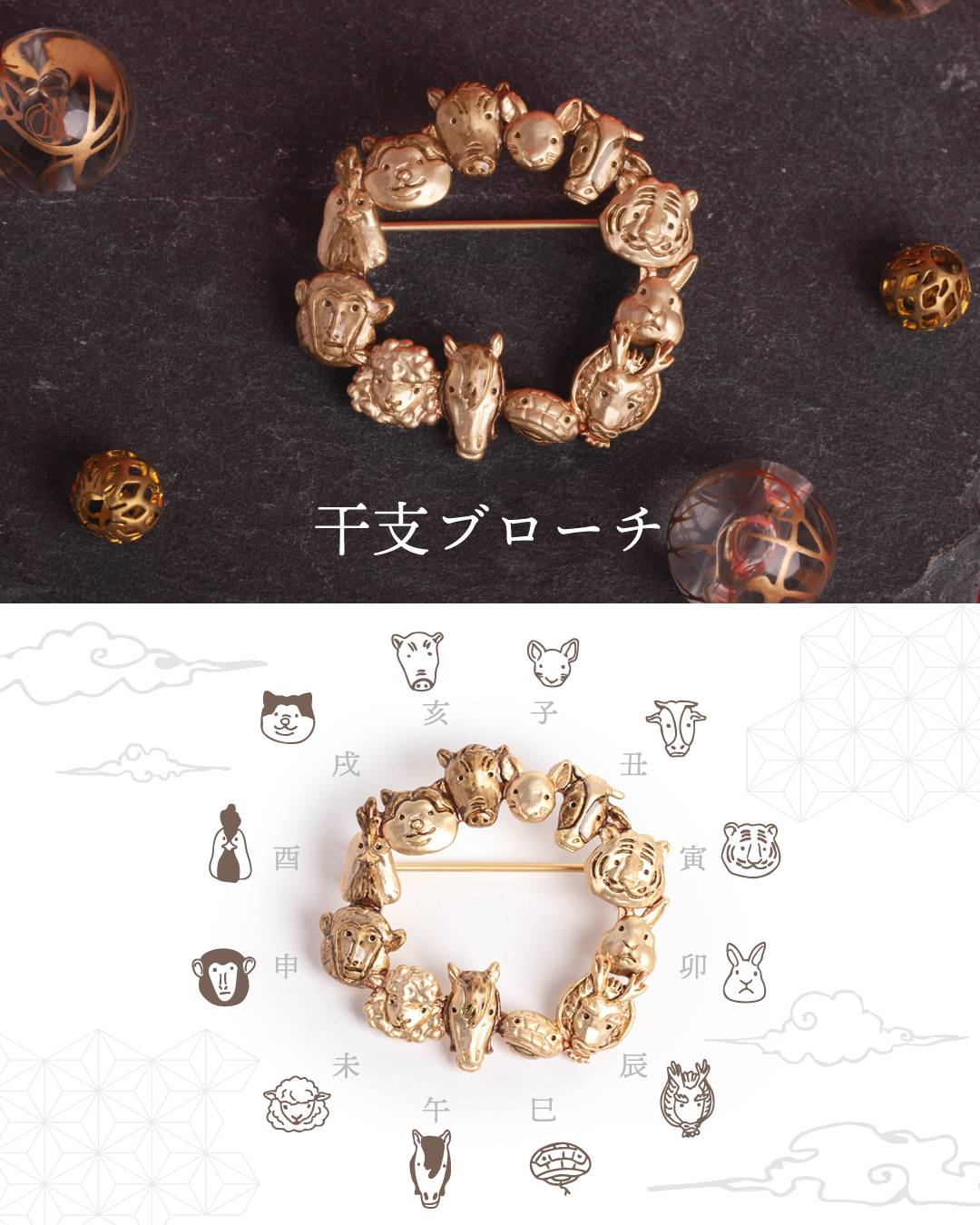 柔らかなタッチで描いた干支ブローチや、左右で表情が異なるキツネ面ピアスなど、