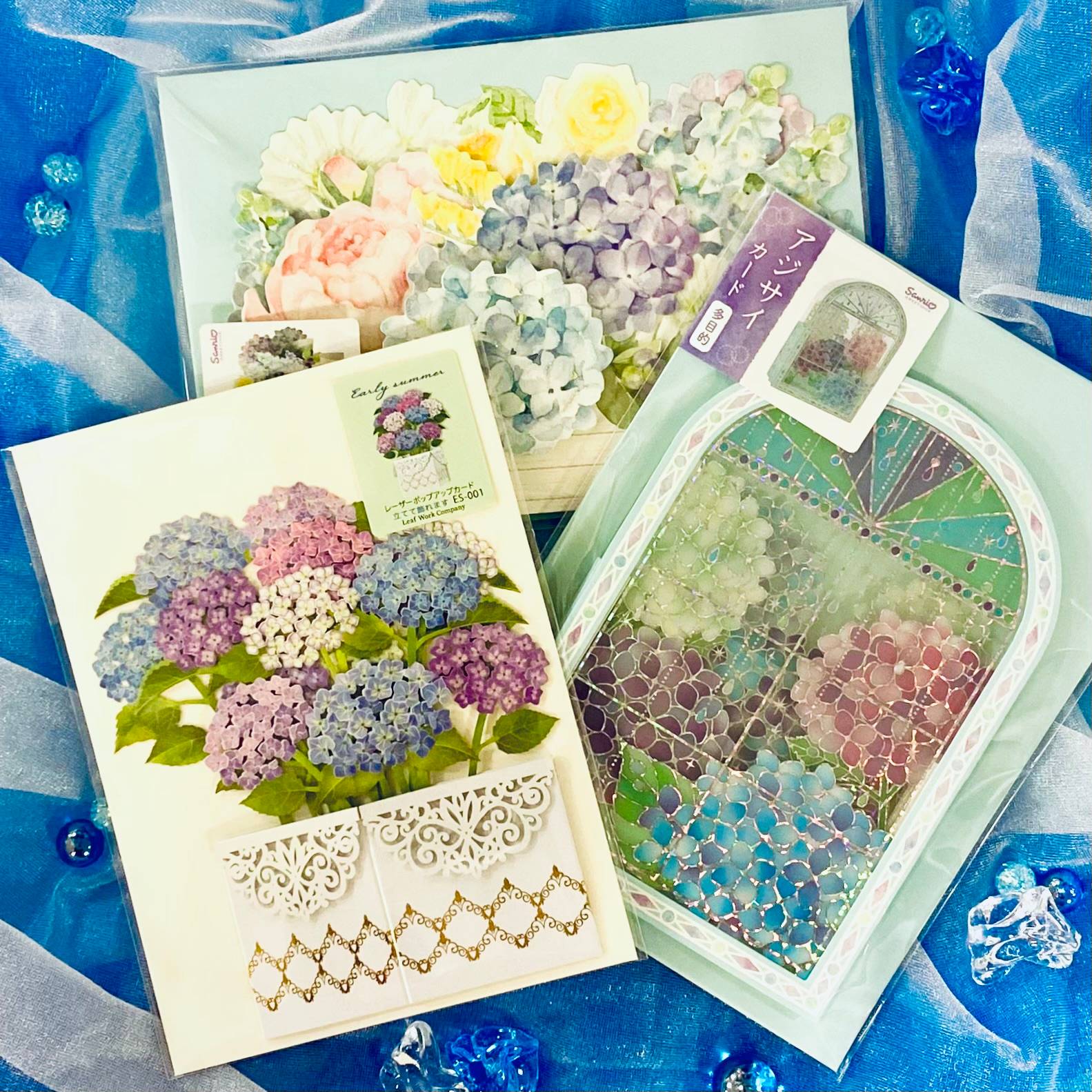 立ててお部屋に飾れる立体カードや、紫陽花のイラストや写真のポストカードなどなど…
